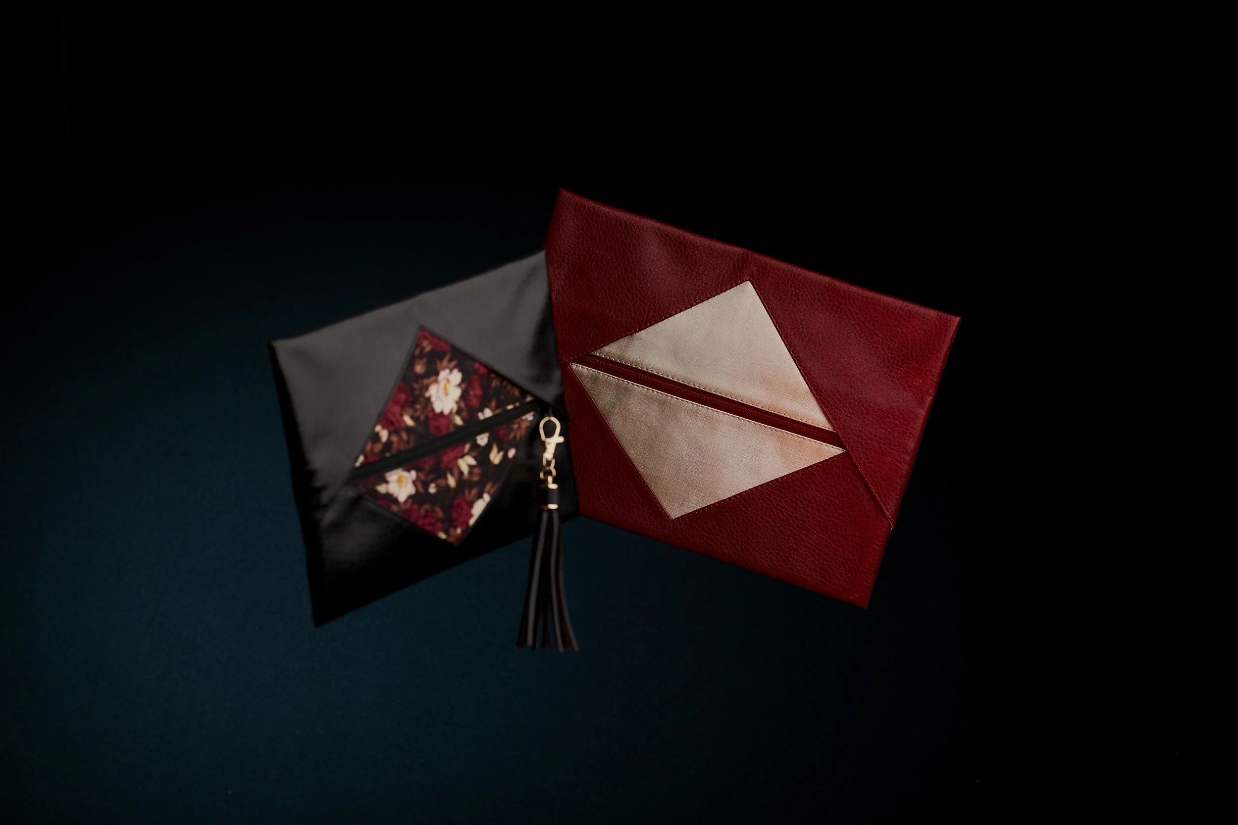 This design is done with this shape, where the part of the sides will cover the other side (where the zipper goes) which in turn forms a triangle, the idea was also to combine two types of fabrics that mark the contrast between both fabrics, in this case a red bag with a touch of gold and the other a black bag combined with a beautiful fabric printed with flowers.